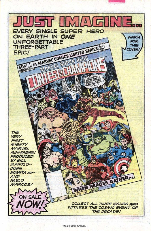 | Un teaser de JR Jr & Bob Layton pour un événement (1982) qui sera la première mini-serie/crossover de Marvel.