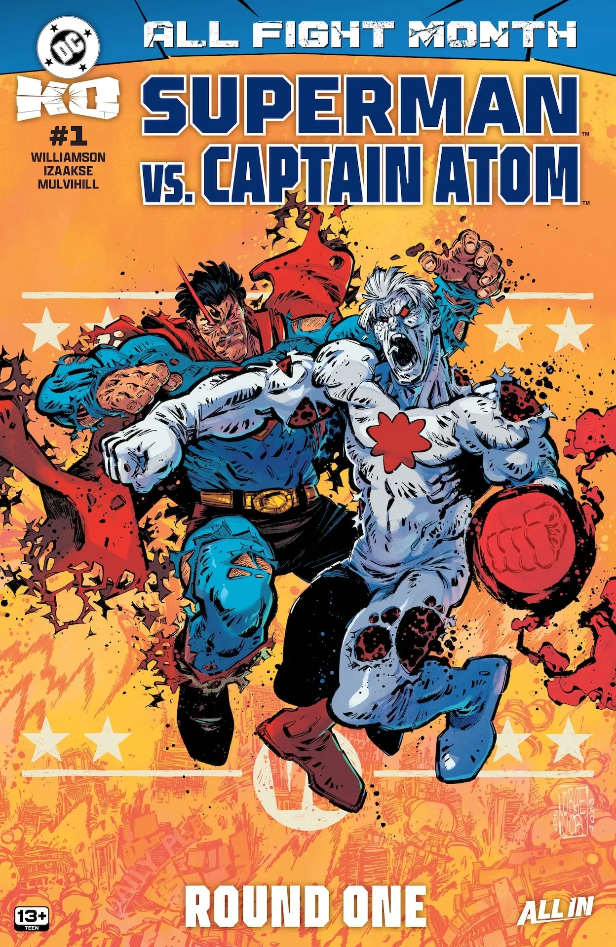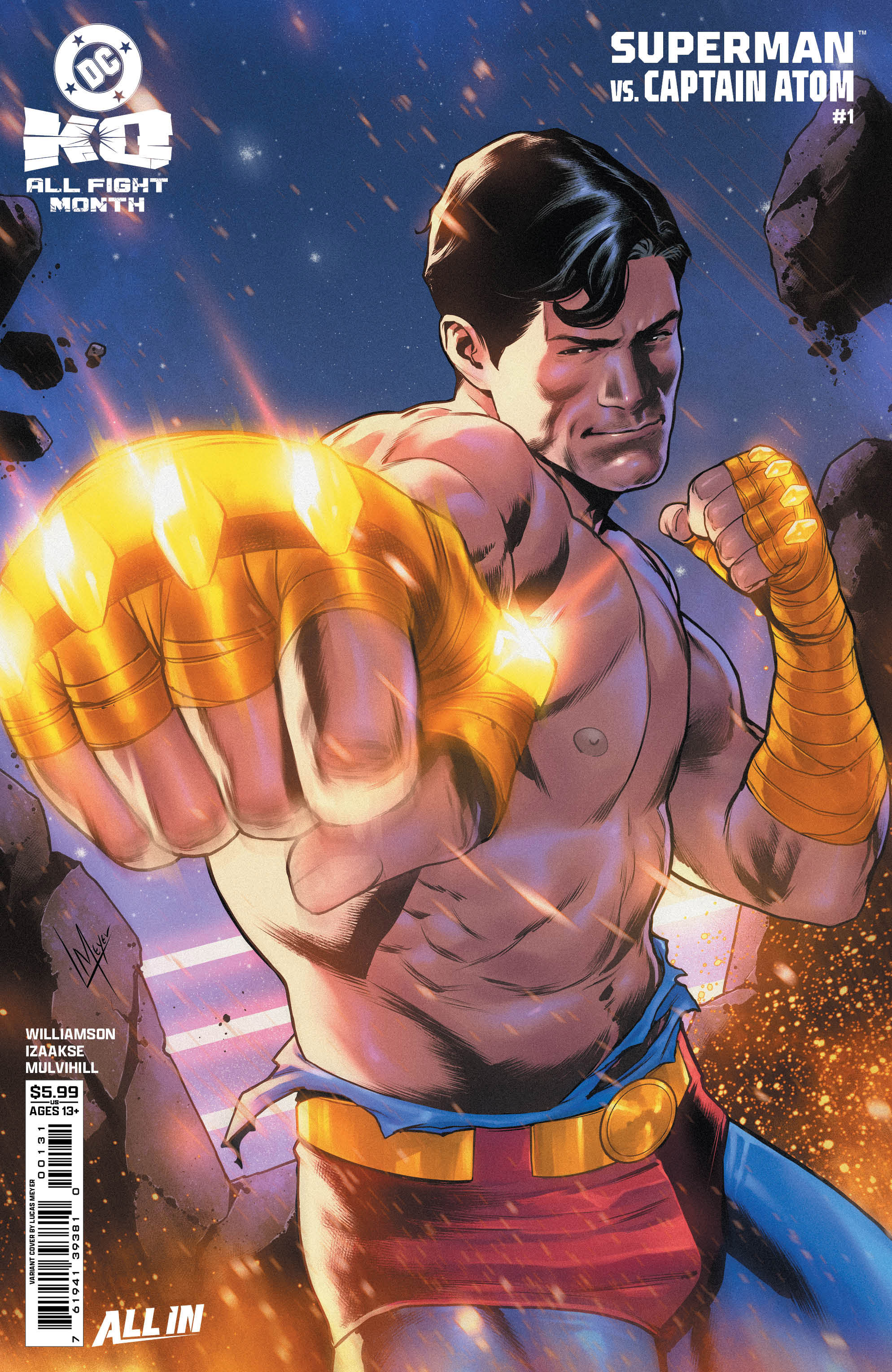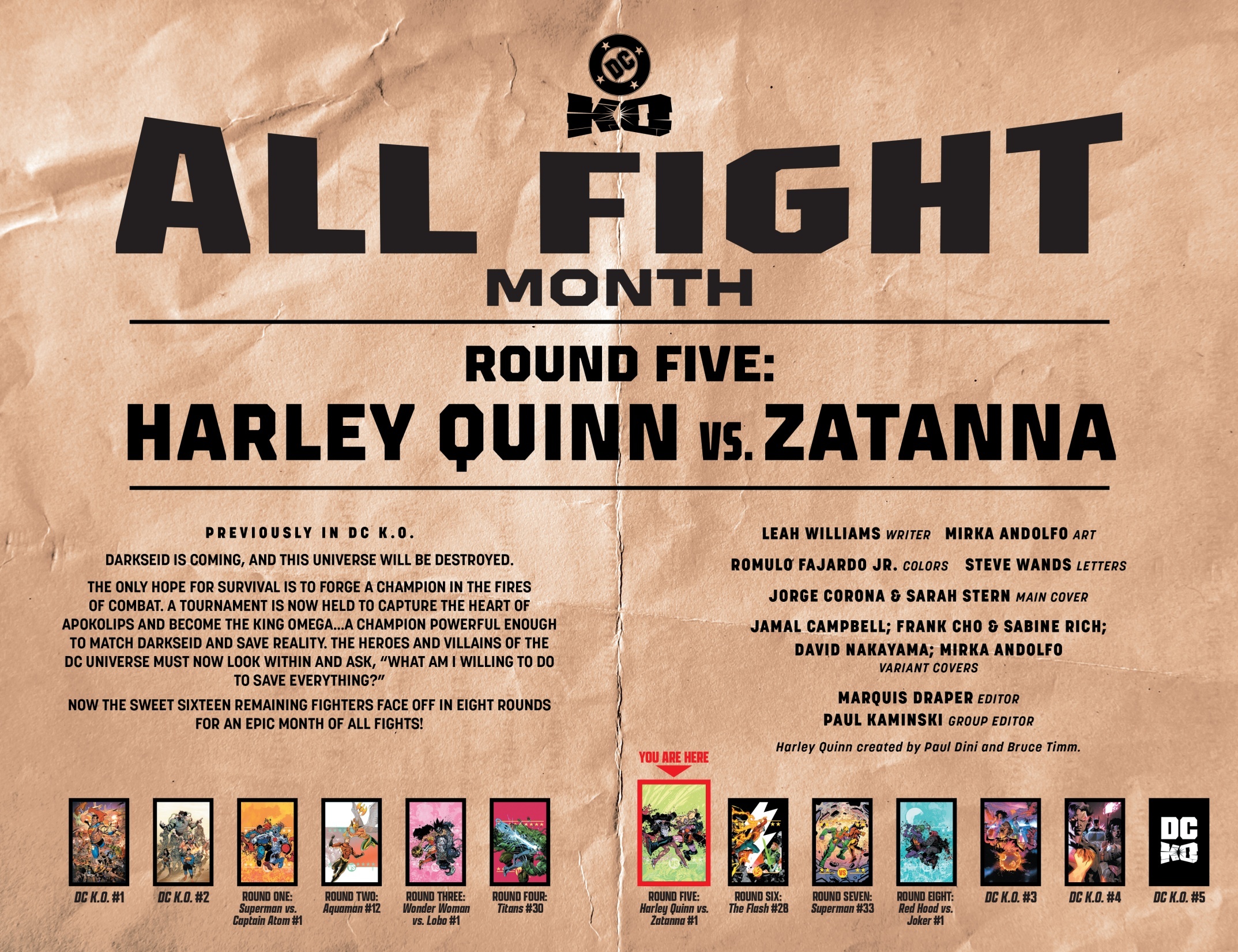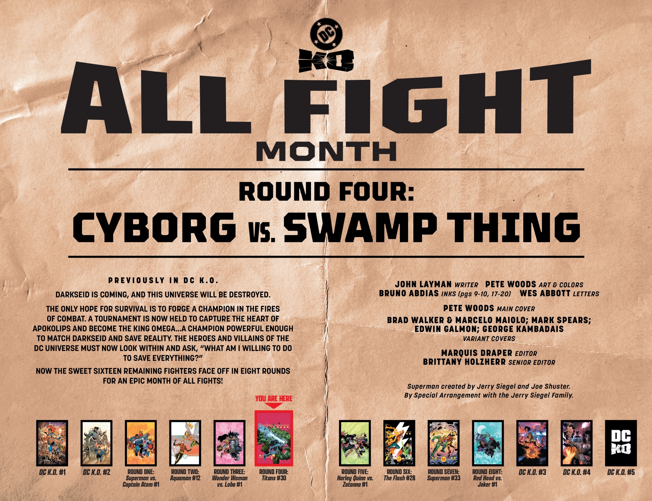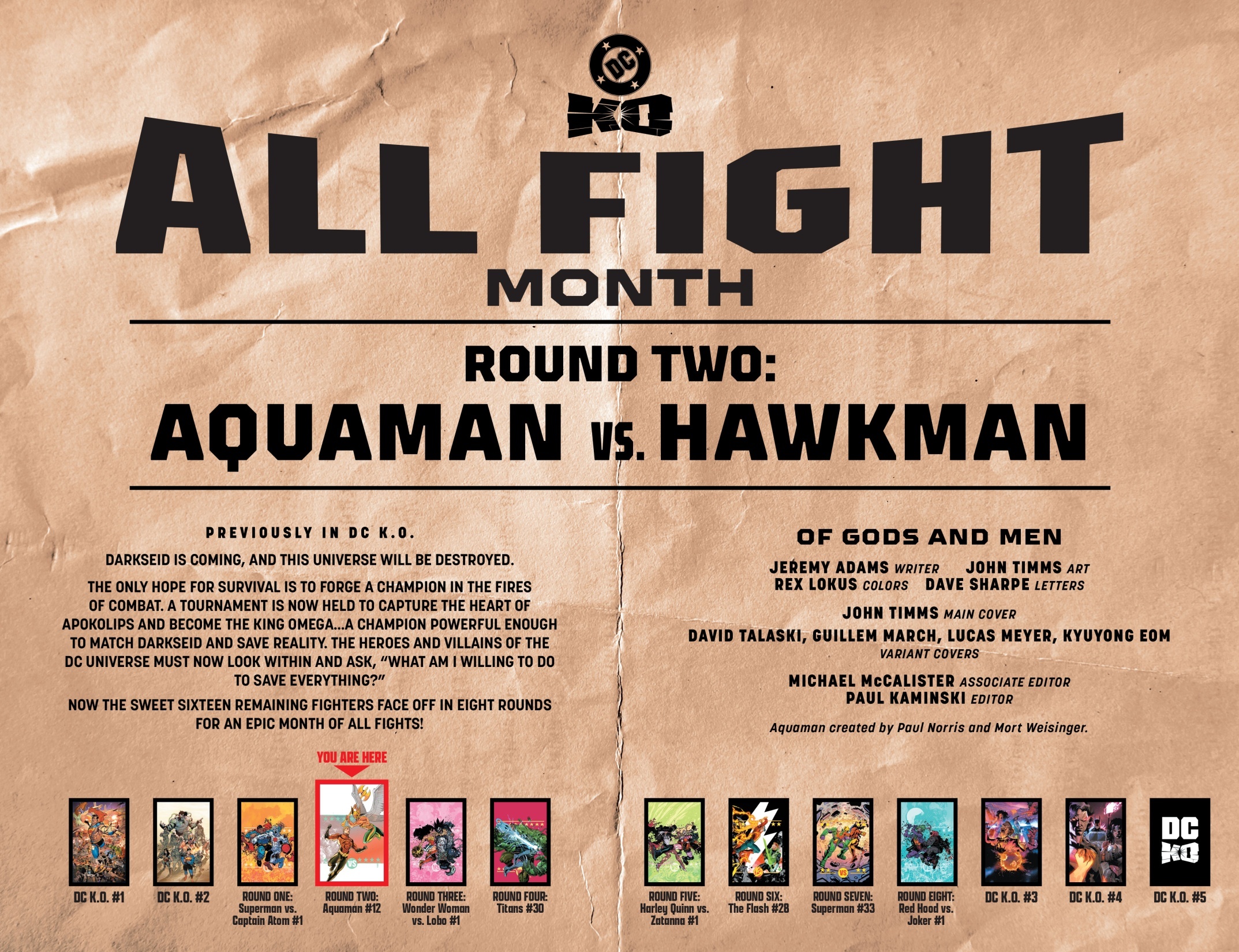 Round 1 — 3 décembre DC K.O.: Superman vs. [ADVERSAIRE CACHÉ] #1 — Joshua Williamson / Sean Izaakse Round 2 — 10 décembre Aquaman #12 — John Timms Round 3 — 10 décembre DC K.O.: Wonder Woman vs. [ADVERSAIRE CACHÉ] #1 — Joëlle Jones / Jason Howard Round 4 — 17 décembre Titans #30 — John Layman / Pete Woods Round 5 — 17 décembre DC K.O.: Harley Quinn vs. [ADVERSAIRE CACHÉ] #1 — Leah Williams / Mirka Andolfo Round 6 — 24 décembre The Flash #28 — Mark Waid & Christopher Cantwell / Vasco Georgiev Round 7 — 24 décembre Superman #33 — Joshua Williamson / Hayden Sherman Finale — 24 décembre DC K.O.: Red Hood vs. [ADVERSAIRE CACHÉ] #1 — Scott Snyder & Joshua Williamson / Dustin Nguyen