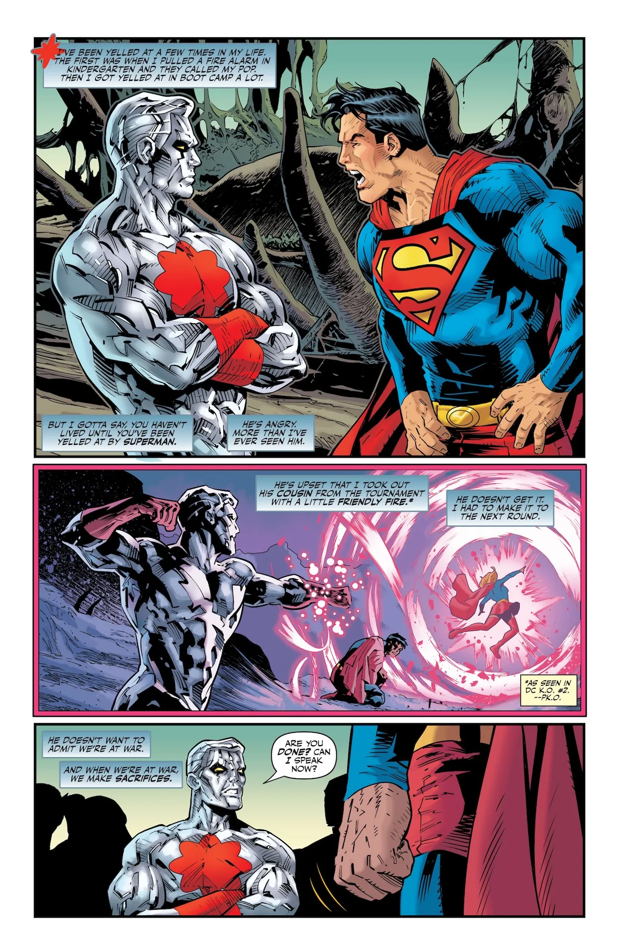 « Ce que nous avons prévu pour Superman. Je veux dire, il est évident qu'il joue un rôle majeur dans DC K.O. et que DC K.O. aura un impact considérable sur DC l'année prochaine. Hum, cet impact sera tel que nous ne pourrons pas le cacher. La fin de K.O. aura un impact sur l'avenir de DC l'année prochaine. Il nous sera donc impossible de le cacher. Cela apparaîtra sur les couvertures et les gens comprendront ce qui se passe. Oui, nous avons des projets vraiment sympas pour Superman et je suis très enthousiaste à leur sujet. J'adore écrire ce livre. » »
