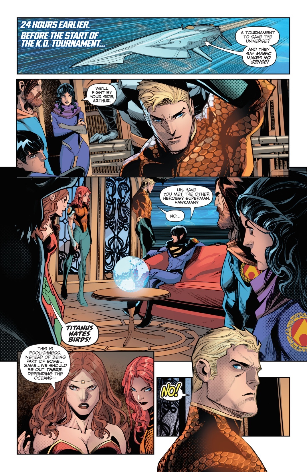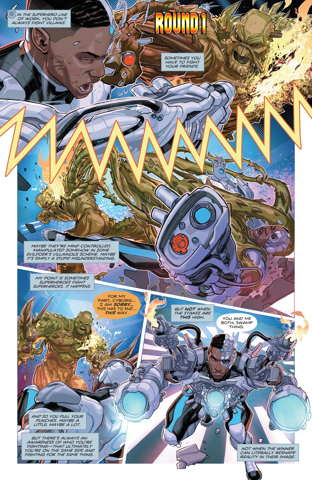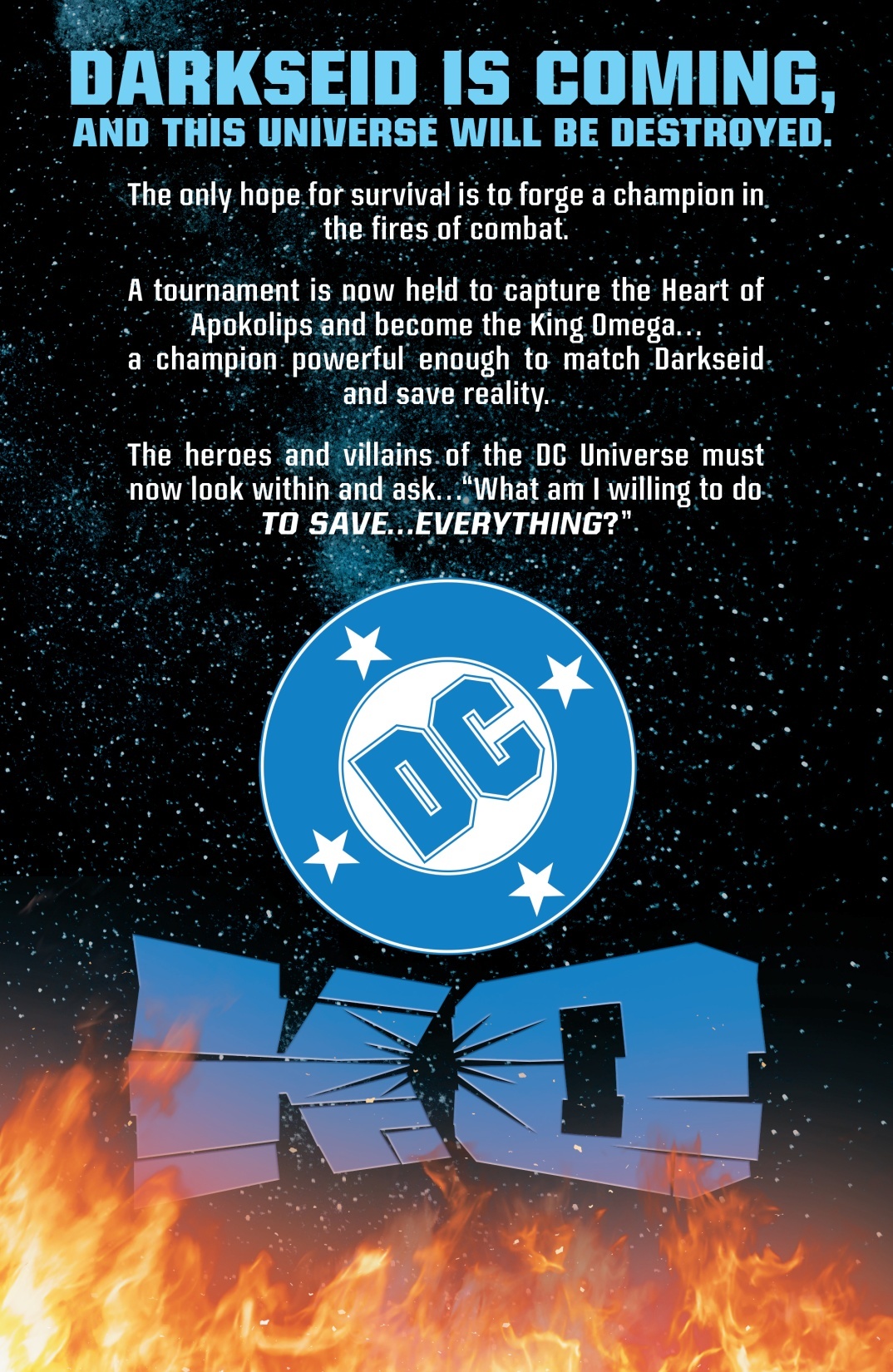 « DC K.O. est notre grand tournoi cosmique, un combat total… C’est le point central de l’histoire, la première rencontre des héros avec cette nouvelle forme que Darkseid a prise. Et c’est leur tentative de trouver un moyen de le vaincre, de devenir quelque chose d’aussi grand et puissant que lui. Ce tournoi est donc un moyen d’y parvenir, de littéralement battre Darkseid à son propre jeu.