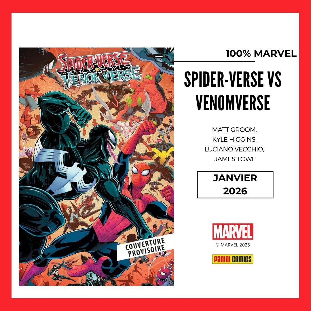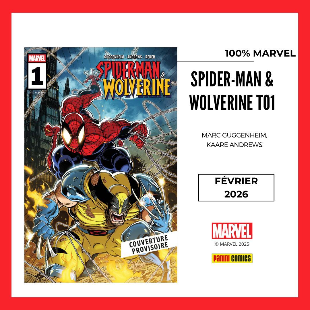 * Deux 100% MARVEL avec le récit complet SPIDER-VERSE VS VENOMVERSE de 176 pages qui raconte un conflit orchestré entre différentes versions des héros et symbiotes mais aussi le tome 1 de SPIDER-MAN & WOLVERINE par Marc Guggenheim & Kaare Andrews !