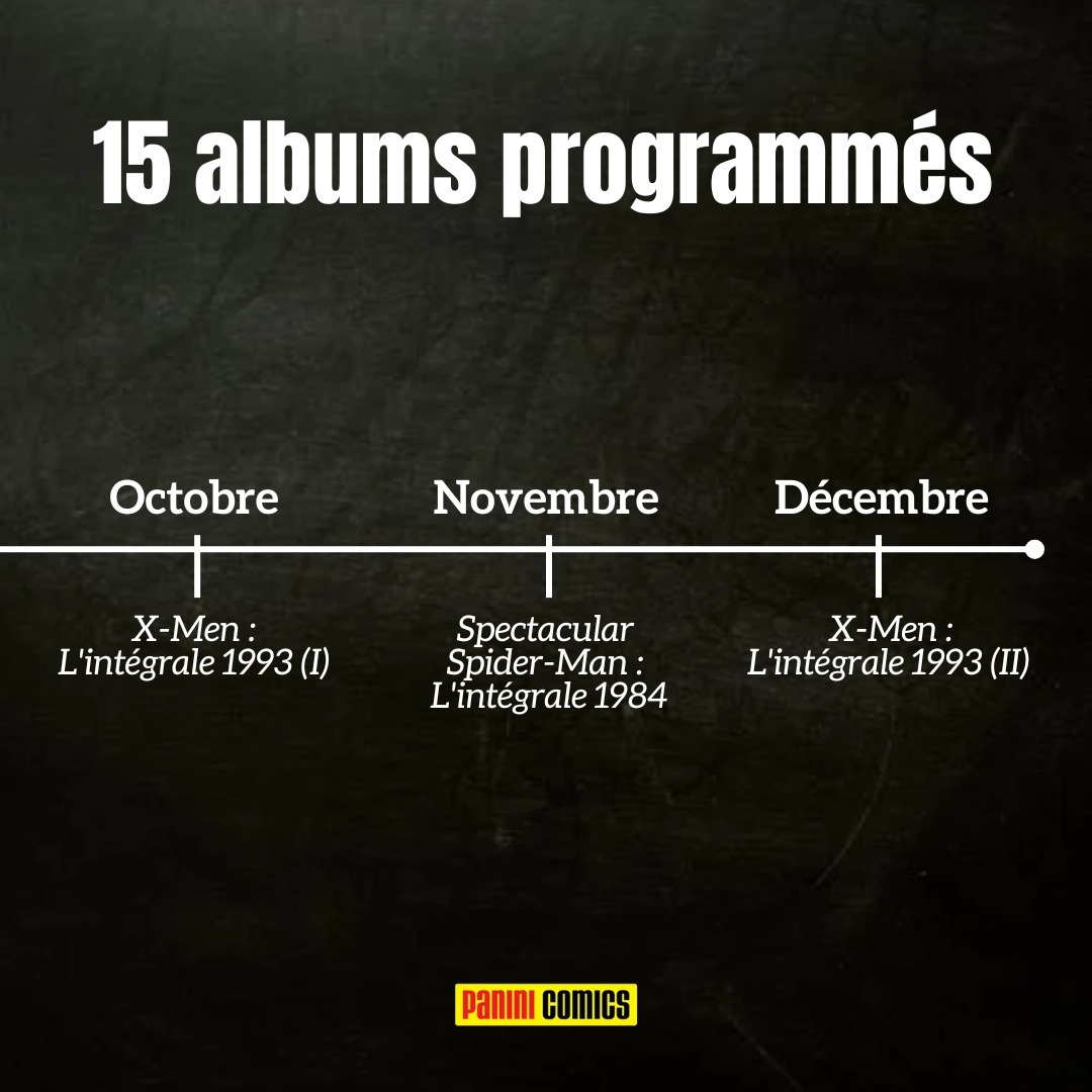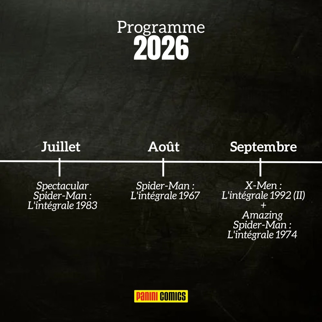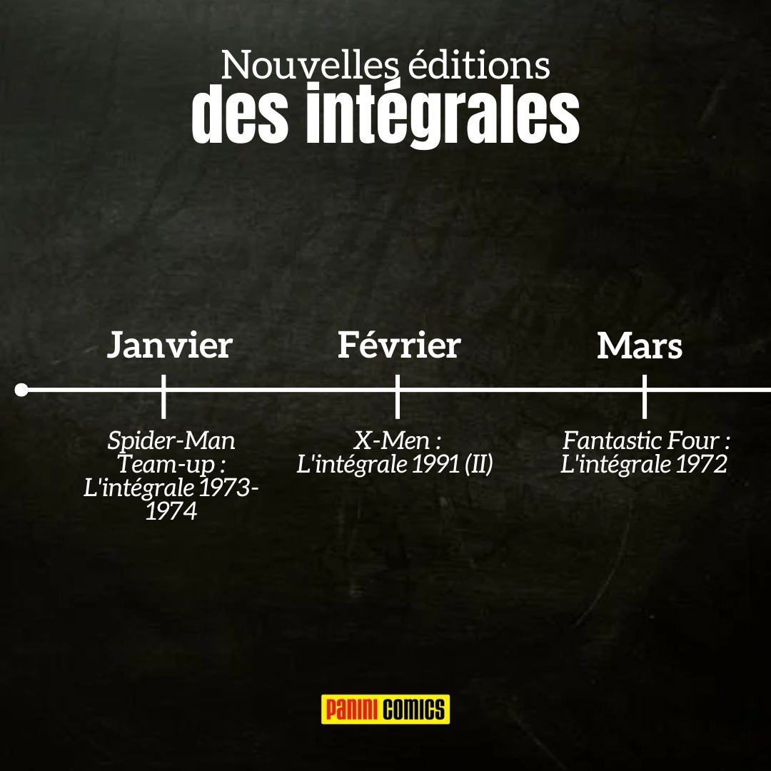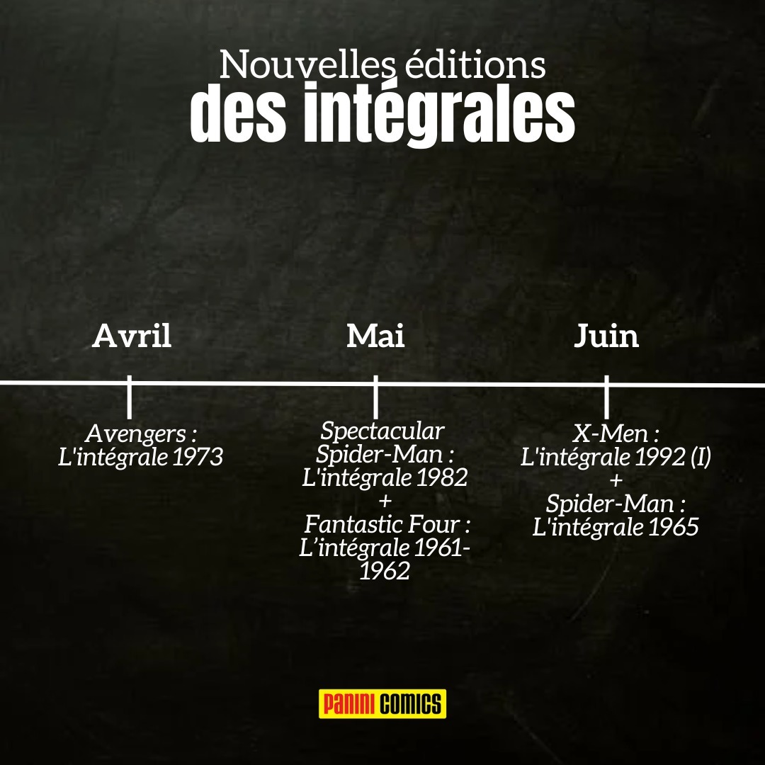 Vous avez la liste sur toute l'année avec les dates mais voici les 4 familles d'intégrales que l'on réimprime : SPIDER-MAN (7 intégrales) : Team-Up 1973-74, Spectacular 1982, 1983 & 1984 et Amazing 1965, 1967 & 1974 X-MEN (5 intégrales) : 1991 (II), 1992 (I & II) et 1993 (I & II) FANTASTIC FOUR (2 intégrales) : 1961-62 & 1972 AVENGERS (1 intégrale) : 1973