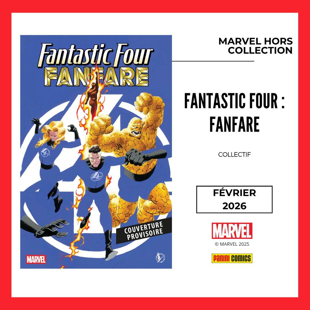 * FANTASTIC FOUR FANFARE est une anthologie de 12 récits signés par : -> Mark Waid, Jonathan Hickman, Alan Davis, Dan Slott, Tom De Falco, Chip Zdarsky, J. Michael Straczynski, Greg Weisman, -> Sara Pichelli, Mark Buckingham, Dustin Weaver, Marcos Martin, Ron Frenz, Mike Allred, Daniel Warren Johnson, Cafu, Mark Bagley Donc, même si toutes les pages sont en couleurs, nous avons décidé de lui donner le même traitement que les anthologies Black, White & Blood pour que vous puissiez profiter des dessins en TRES GRAND format !