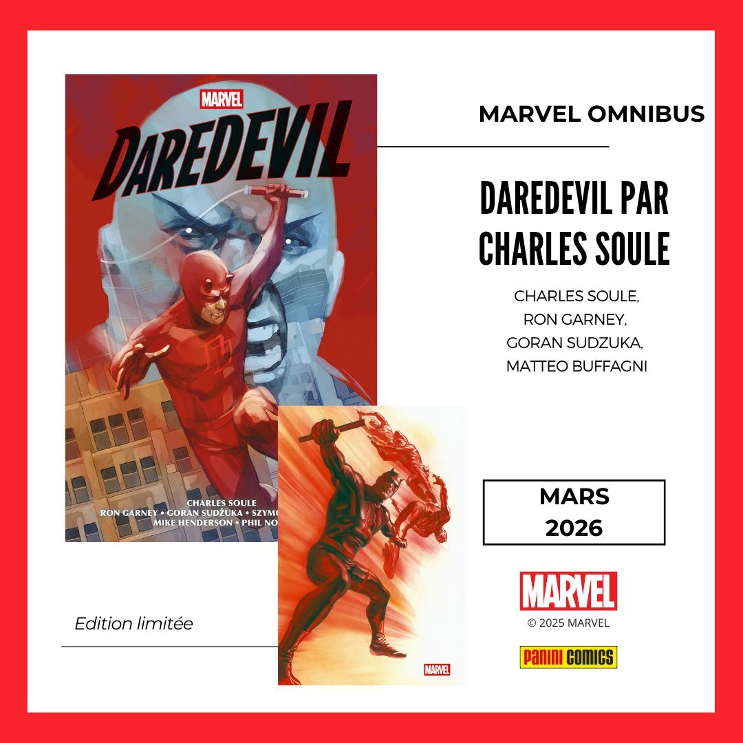 * Et ensuite, il es très réclamé depuis quelques temps, c'est le MARVEL OMNIBUS : DAREDEVIL par CHARLES SOULE qui compile au fil de 1200 pages tout le run du scénariste. Avec Ron Garney, Matteo Buffagni et Phil Noto aux dessins.
