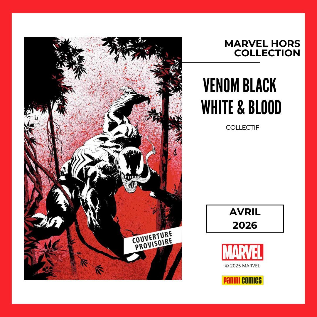 * enfin, toujours en avril, c'est VENOM : BLACK WHITE & BLOOD. Vous connaissez le principe : une anthologie tricolore par de très grands noms ! Ici : David Michelinie, Ryan North, J.M. DeMatteis, Dave Wachter, Erik Larsen, Takashi Okazaki, Al Ewing, Chris Bachalo ou encore David Dastmalchian !