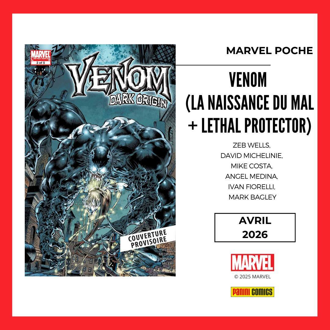 * En avril c'est deux titres sur VENOM en solo cette fois ci avec tout d'abord un POCHE autours de ses débuts avec 3 mini-séries : Dark Origin de Zeb Wells & Angel Medina, Lethal Protector (2022) de David Michelinie & Ivan Fiorelli et First Host de Mike Costa & Mark Bagley. Un tome à dévorer pour tous les fans des symbiotes et qui est un parfait complément aux Omnibus Spider-Man !
