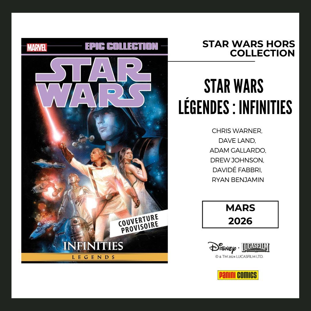 * Tout d'abord, la sortie de deux nouveaux titres dans la collection "Légendes"/dos toilés (comme La trilogie de Thrawn ou La Guerre des Etoiles) avec ici JANGO FETT : OPEN SEASONS centré sur le père de Boba et un album que nous n'avions pas publié pour l'instant : STAR WARS INFINITIES qui joue le rôle de "What If..?" pour les films de la trilogie d'origine !