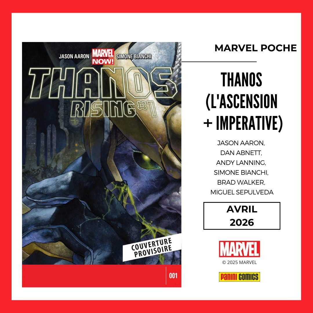 * En MARVEL POCHE un album dédié à THANOS avec un double programme autour du Titan Fou et de son rapport à la Mort avec un tome compilant Thanos Imperative (d'Abnett, Lanning et Walker) et Thanos l'Ascension (d'Aaron et Bianchi).
