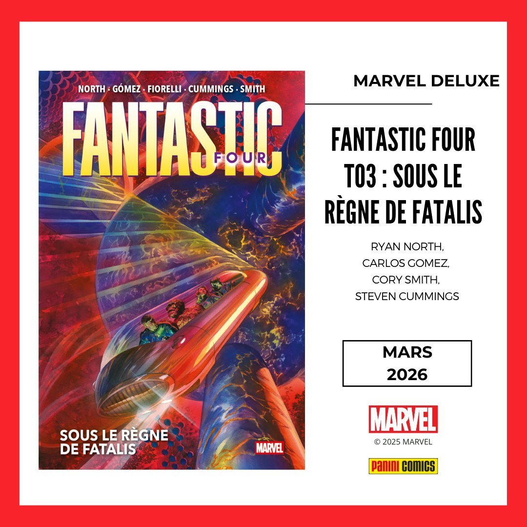 * De l'inédit avec le 3e tome des FANTASTIC FOUR de Ryan North & co qui signe la fin de la première série du scénariste ! Quant au relaunch (toujours par North) avec Humberto Ramos aux dessins ? Vous pourrez le retrouver le même mois au sommaire de MARVEL WORLD aux côtés d'Amazing Spider-Man, des séries Avengers et de la suite de One World Under Doom !